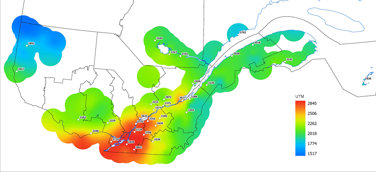 Les unités thermiques maïs (UTM) sont des indices mesurant la quantité de chaleur disponible à la croissance et à la maturation des plantes. Les UTM s'accumulent lorsque la température minimale quotidienne observée est supérieure à 4,4°C. En fin de saison, les UTM ne sont plus comptabilisées lorsque la température atteint -2°C.