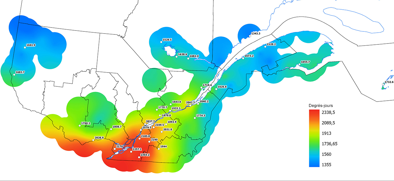 Le degré-jour est un indice mesurant la quantité de chaleur disponible à la croissance et à la maturation des plantes. Les degrés-jours sur la base 5 degrés Celsius s’accumulent lorsque la température moyenne quotidienne dépasse 5 °C.
