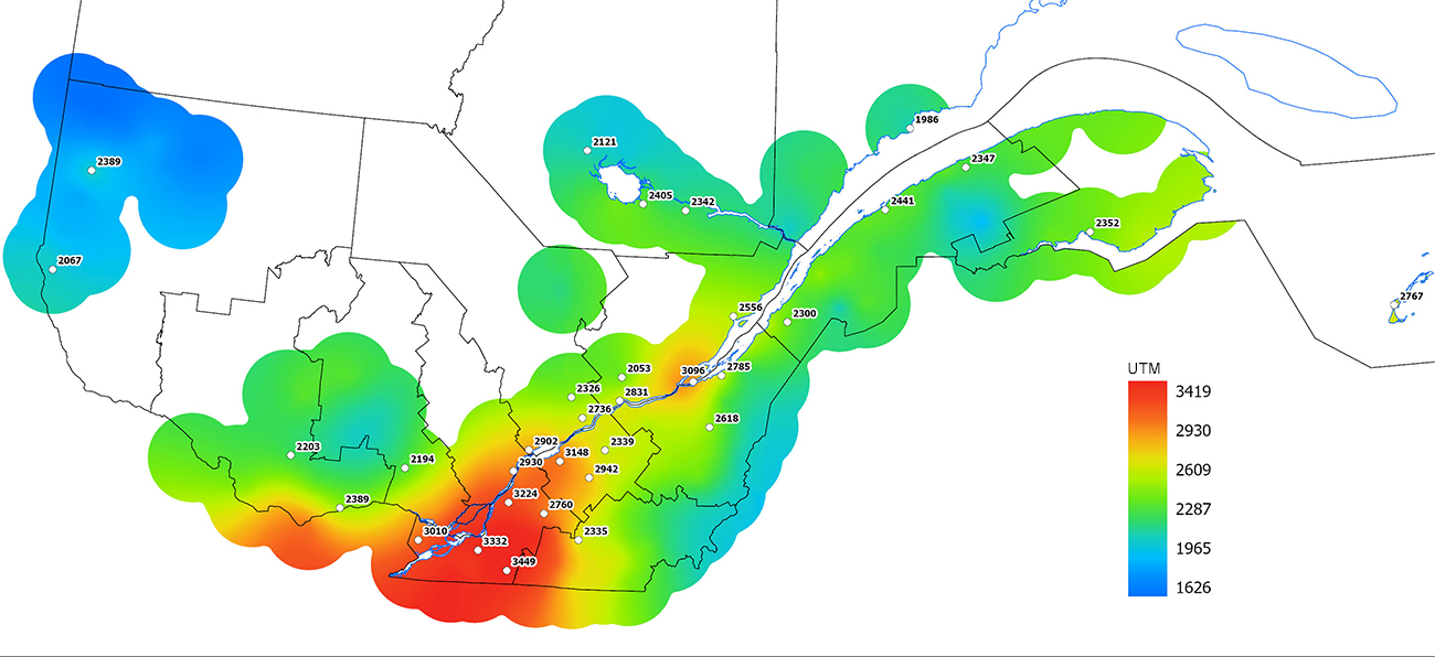 L’unité thermique maïs (UTM) est un indice mesurant la quantité de chaleur disponible à la croissance et à la maturation des plantes. Les UTM s’accumulent lorsque la température minimale quotidienne observée est supérieure à 4,4 °C. En fin de saison, les UTM ne sont plus comptabilisées lorsque la température atteint -2 °C.
