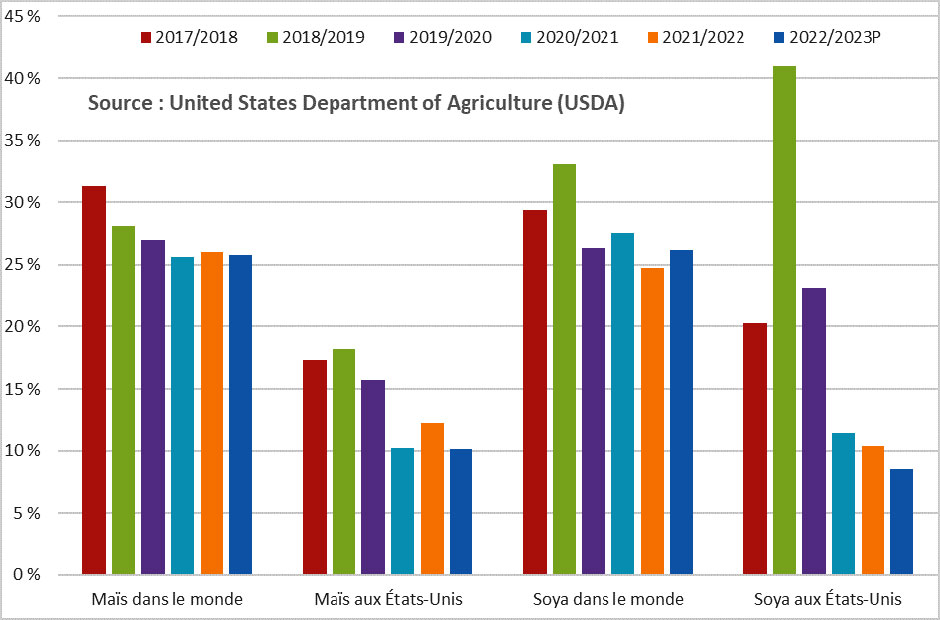 De 2017-2018 à 2022-2023, les ratios du stock de clôture divisé par la consommation totale connaissent une tendance à la baisse, et ce, tant pour le soya que le maïs et tant du côté des États-Unis qu'au niveau mondial.