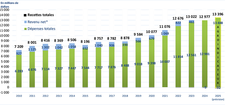 Recettes monétaires agricoles totales, dépenses et revenu agricole net* de 2010 à 2025